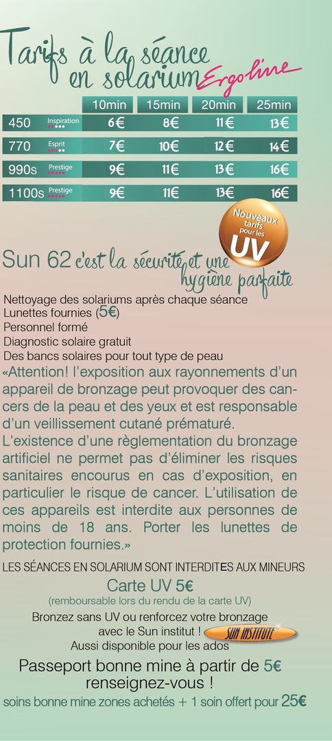 "Attention ! L'exposition aux rayonnements d'un appareil de bronzage peut provoquer des cancers de la peau et des yeux et est responsable d'un vieillissement cutané prématuré. L'existence d'une réglementation du bronzage artificiel ne permet pas d'éliminer les risques sanitaires encourus en cas d'exposition, en particulier le risque de cancer. L'utilisation de ces appareils est interdite aux personnes de moins de 18 ans. Porter les lunettes de protection fournies."Attention ! L'exposition aux rayonnements d'un appareil de bronzage peut provoquer des cancers de la peau et des yeux et est responsable d'un vieillissement cutané prématuré. L'existence d'une réglementation du bronzage artificiel ne permet pas d'éliminer les risques sanitaires encourus en cas d'exposition, en particulier le risque de cancer. L'utilisation de ces appareils est interdite aux personnes de moins de 18 ans. Porter les lunettes de protection fournies.